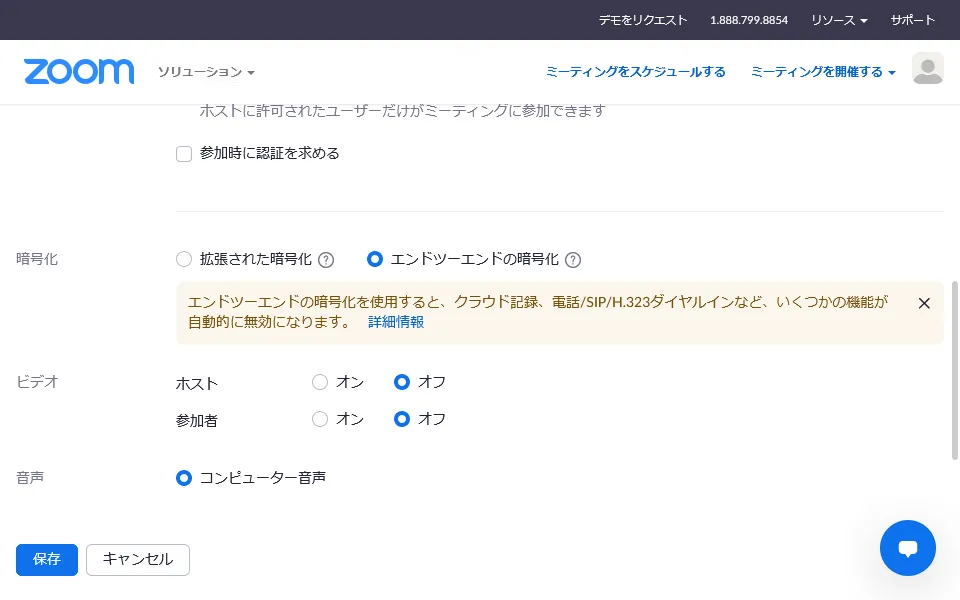 E2E暗号化を利用したい場合は,まず,Zoomの「設定」画面にて,「エンドツーエンドの暗号化の使用を許可する」をオンにしてください.この設定をオンにすると,ミーティングを作成(スケジュール)する際の設定に「暗号化」という項目が表示されるようになり,「エンドツーエンドの暗号化」と通常の「拡張された暗号化」の2種類の暗号化をミーティングごとに選択できるようになります.