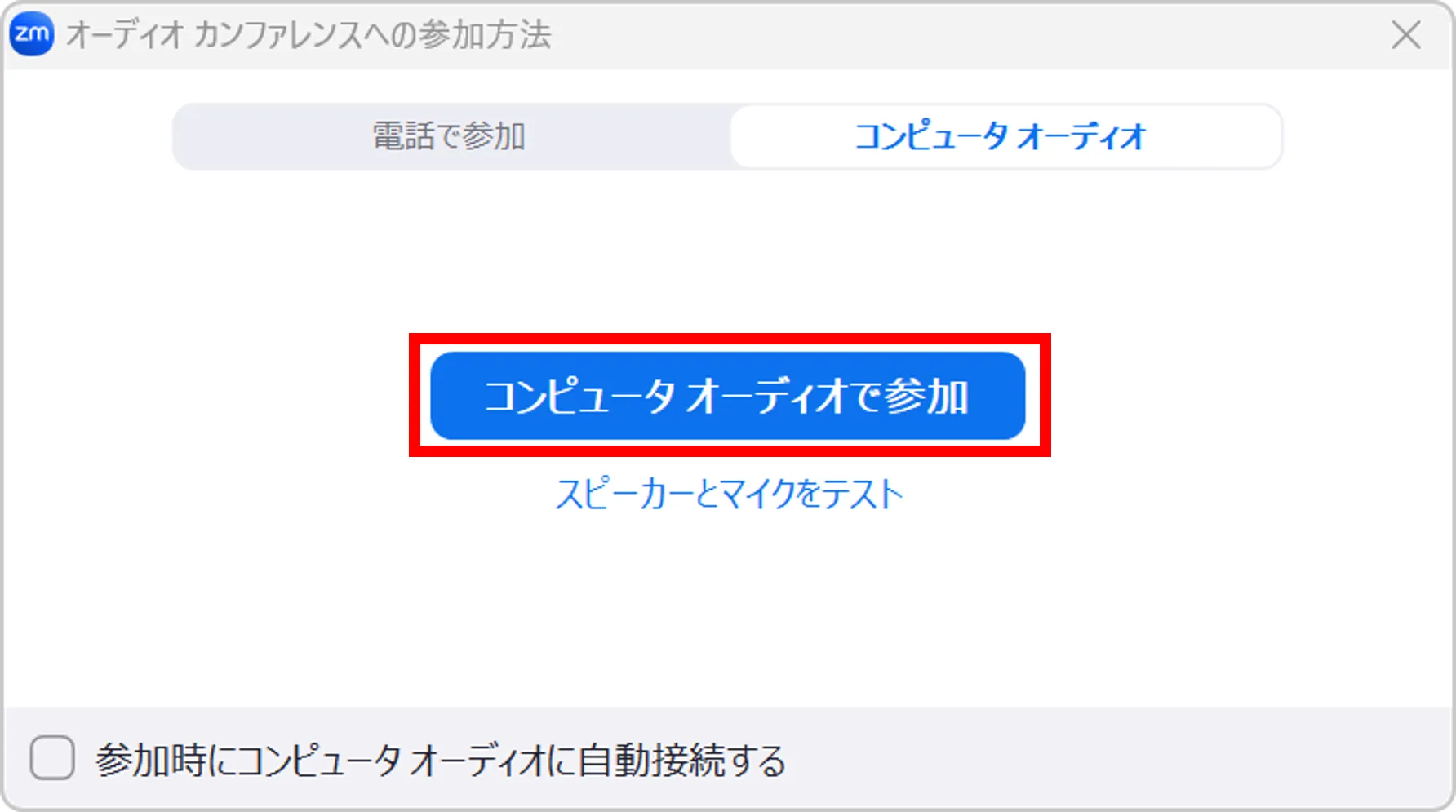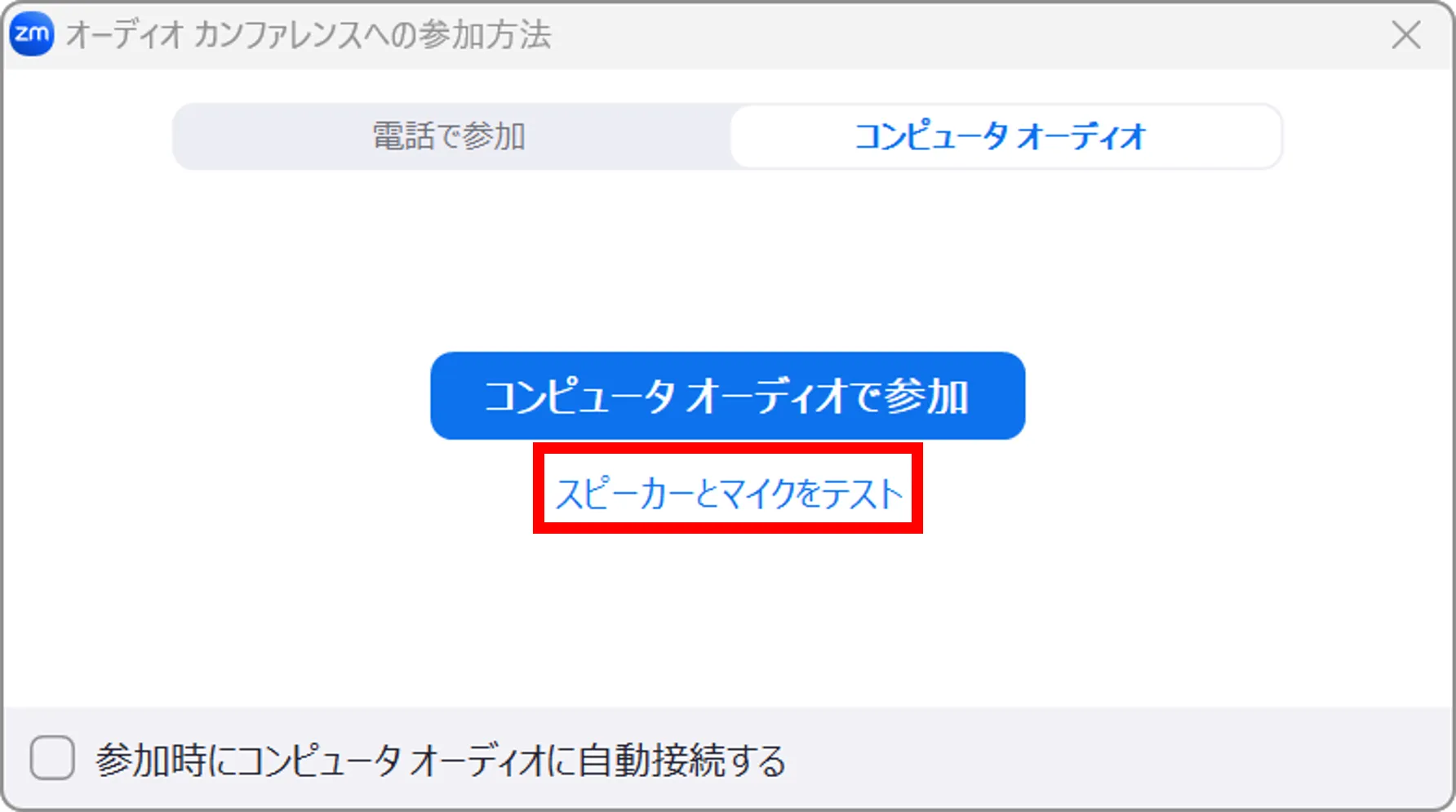 「参加時にコンピュータでオーディオに自動で接続する」の設定がオフになっている場合,ミーティングに参加した際に表示されるウィンドウの「スピーカーとマイクをテスト」を押してください.