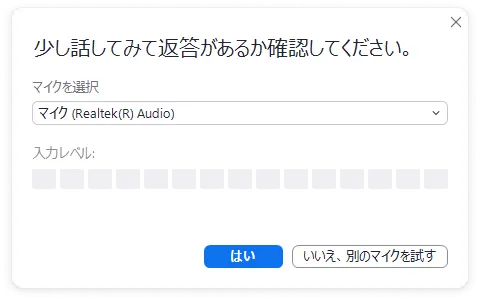 - 問題がなければ「はい」を押してください.問題があれば「いいえ,別のマイクを試す」のボタンを押すか,別のマイクを選択して同様に確認してください.